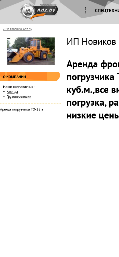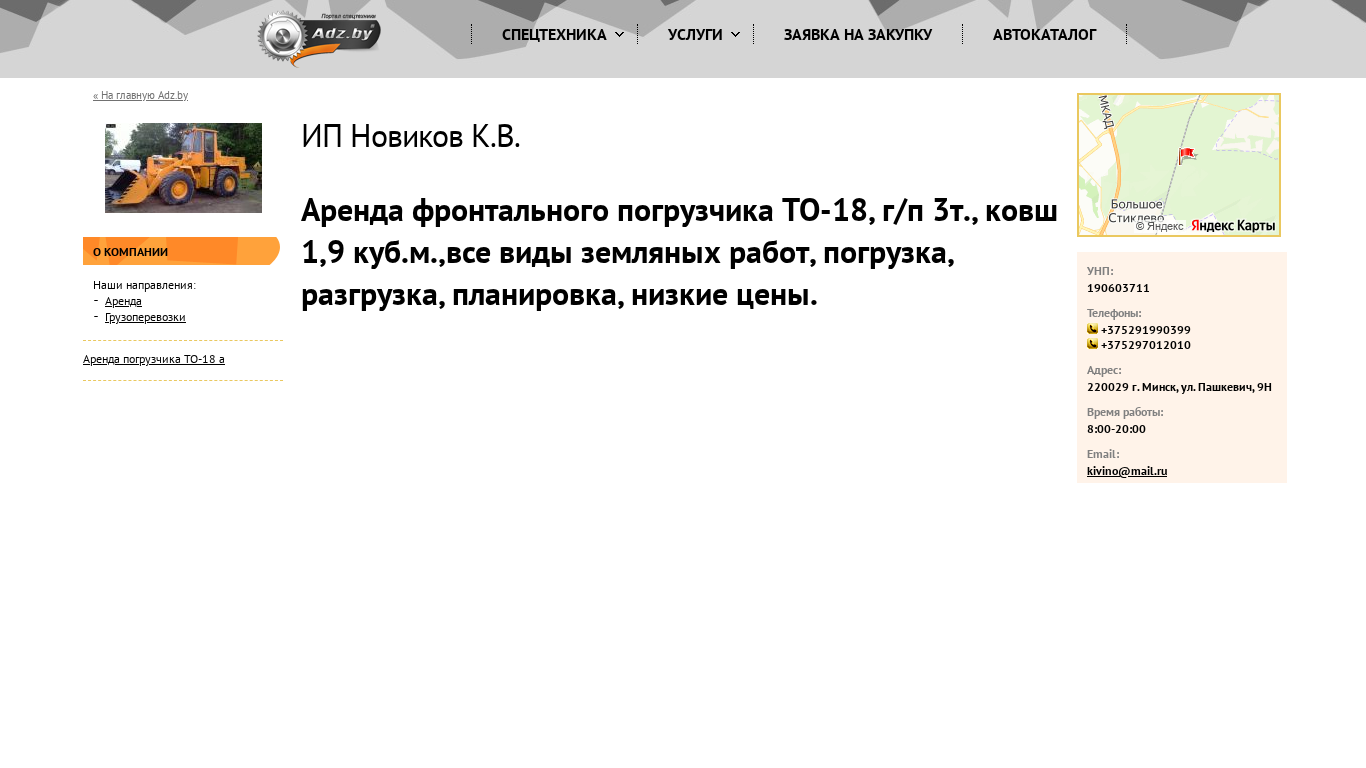--- The portal novikov.adz.by is operated by IP Novikov K.V. and offers services related to specialized equipment, technology, and machinery, as well as spare parts, repairs, rentals, credits/leasing, and cargo transportation. Keywords associated with the website include "аренда" (rental), "новиков" (Novikov), "грузоперевозки" (cargo transportation), "adz" (Adz.by), "погрузчика" (loader), "то-18" (model T-18), "спецтехника" (special equipment), "техника" (technology), "оборудование" (equipment), "запчасти" (spare parts), "услуги" (services), "ремонт" (repair),