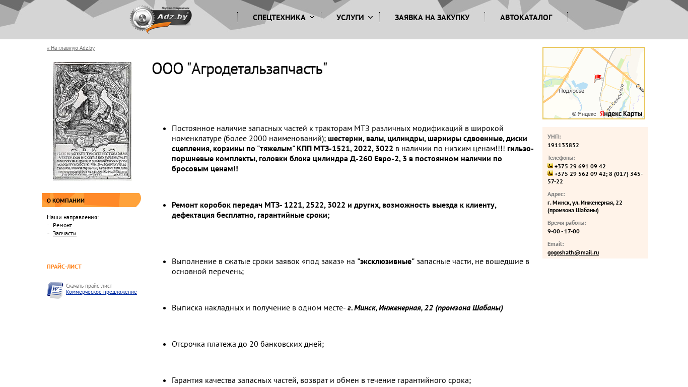| AI-анализ | The web project "ООО "Агродетальзапчасть" (agrodetalzap.adz.by) is an online platform for a Belarusian company specializing in the sale of spare parts for agricultural machinery, specifically for MTS tractors. The website provides information on the company's services, which include repair, credit/leasing, and rental. The main focus of the site is the extensive inventory of over 2000 spare parts in stock, ranging from gears, cylinders, and shafts to more complex components like differential cases and transmissions for various MTS models. The company offers competitive prices and the possibility of on-site repair, with a free diagnosis for defects. Customers can also place orders for exclusive parts not listed in the standard catalog. The website provides contact information, including phone numbers and an email address, for customers to get in |
