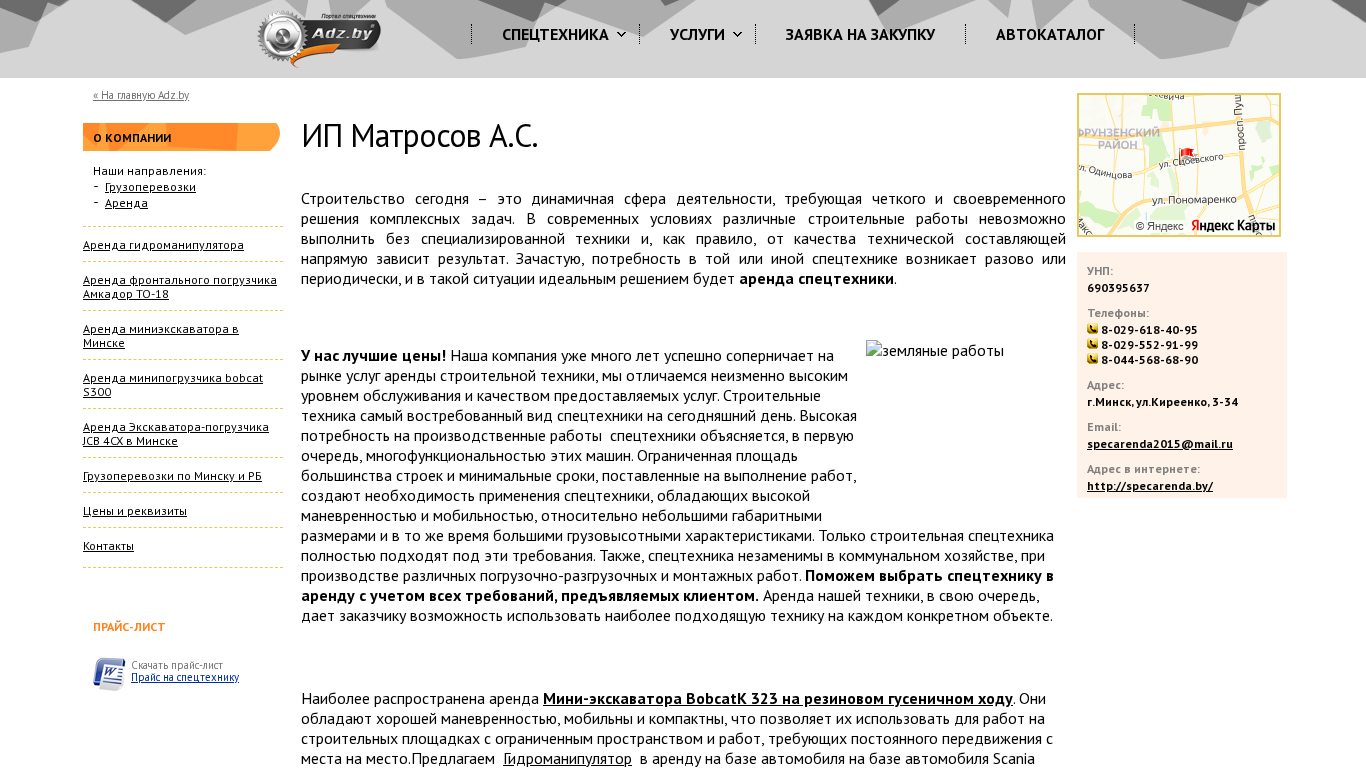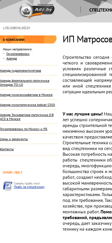 | AI-анализ | The portal matrosov.adz.by is a specialized website for renting construction and special equipment, offering a wide range of services including equipment rental, repair, credit/leasing, and transportation. The company, IP Матросов А.S., prides itself on providing high-quality services and competitive prices. The website features a catalog of various types of equipment for rent, such as hydraulic manipulators, front-end loaders, and excavators, among others. Users can find contact information and pricing details on the website, as well as make inquiries or download a price list. The company's UNP number is 690395637 and they can be reached by phone at 8-029-618-40-95, 8-029-552-91-99, or |