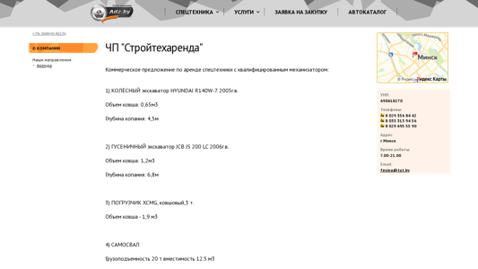 | AI-анализ | This website is the online presence of commercial entity "ЧП "Стройтехаренда" (ChP "Stoyteharenda") offering rental services for special equipment and machinery, as well as equipment maintenance, repair, credit/leasing, and cargo transportation. The keywords associated with the website include "equipment rental," "excavator," "bucket," "construction," "pump," "truck," "load capacity," and "special technology." The top_words indicate a focus on "volume," "bucket," "rental," "excavator," "depth," "company," and "purchase request." The website contains information about specific equipment for rent, such as two excavators with different capacities and two different types of trucks, along with their load capacities and dimensions. The contact information includes multiple phone numbers, an email address, and a physical address in Minsk |