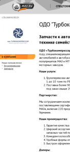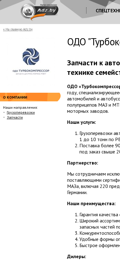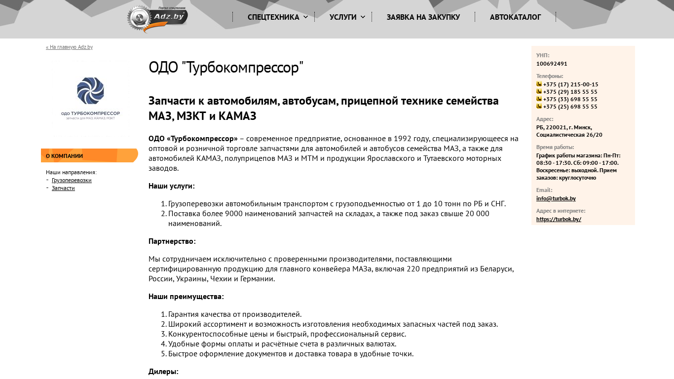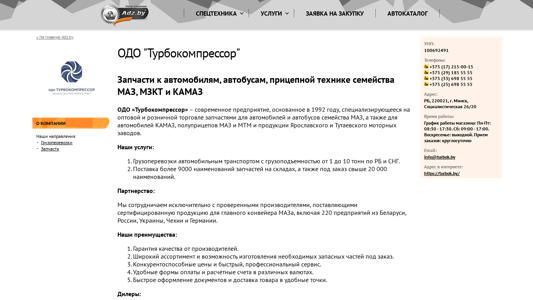 | AI-анализ | The portal ODO "Turbocompressor" is a Belarusian business-to-business and business-to-consumer e-commerce website specializing in the sale of spare parts for automobiles, buses, and towing vehicles of the MAZ, MZKT, and KAMAZ families, as well as cargo transportation services using vehicles with a capacity of up to 10 tons within Belarus and the CIS. The company was established in 1992 and offers a wide range of over 9000 available spare parts on its shelves, with the possibility of ordering over 20,000 additional items. The website collaborates exclusively with proven manufacturers, providing certified products from over 220 suppliers in Belarus, Russia, Ukraine, Czechia, and Germany. The advantages of the portal include quality guarantees from manufacturers, a wide range of |