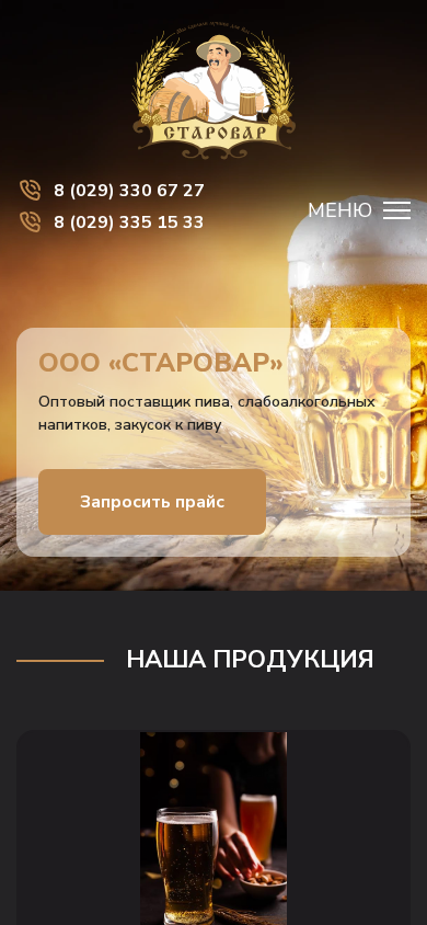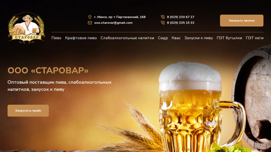 | AI-анализ | --- This website is for an optimum beer supplier in Minsk, Belarus named OOO "Stanovar." The company offers bulk beer sales in kegs and provides contacts for phone inquiries: +375 29 330 67 27, +375 29 335 15 33. The website lists various beer brands, slab alcoholic beverages, cider, quas, snacks to accompany beer, and PET bottles and kegs for sale. OOO "Stanovar" has been in business since 2014 and boasts a reputable collection of over 50 beer and snack brands. Regular deliveries are made throughout Belarus, and discounts and favorable terms are given to loyal clients. The company positions itself as a reliable partner for wholesale beer, sl |