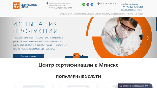 | AI-анализ | The web project "Cert-Group.by" is a Belarusian certification service offering product and service certification in the Republic of Belarus. The website provides flexible pricing and quick document processing, with a wide range of services offered. Visitors can contact the company by phone at +375 (29) 692-00-81 or submit a request on the site. The company is located in Minsk, Belarus, at Kransozvezdnaya 18B street. Services include certification for various products such as low-voltage equipment, children's products, textiles, packaging, and building materials, among others. The company is an accredited testing laboratory and offers mandatory certification, certification for various standards including ISO 9001, and confirmation of product compliance with technical regulations. The website also provides information on various certifications and related concepts, as |