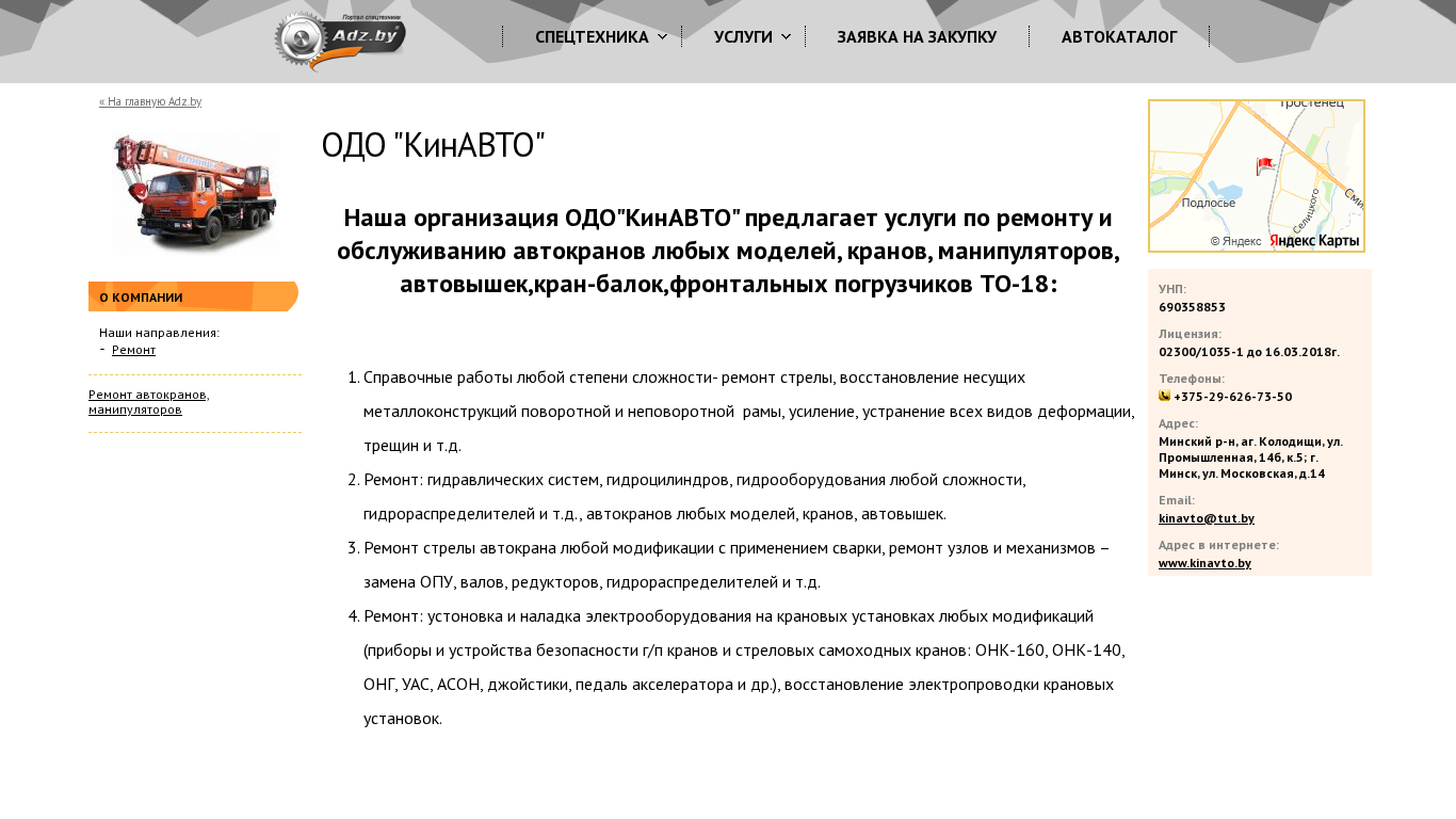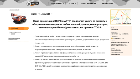 | AI-анализ | The web project "ОДО "КинАВТО" is a Belarusian company offering services for the repair and maintenance of various types of cranes, manipulators, and lifting equipment, including auto cranes, crane booms, front loaders, and hydraulic systems. The project's title is "ОДО "КинАВТО," and its main keywords are "ремонт," "кранов," "одо," "кинавто," "автокранов," "адрес," and "услуги." The company's UNP number is 690358853, and it holds a license until March 16, 2018. The phone numbers provided are +375-29-626-73-50 and an email address of kinav |