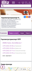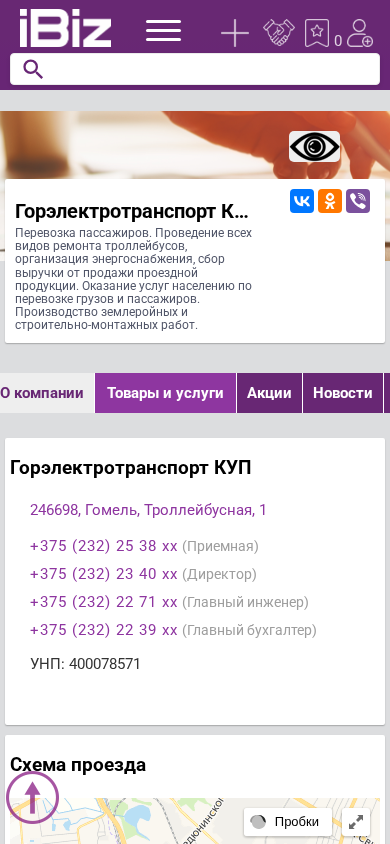 | Название / Заголовок | Горэлектротранспорт КУП - Перевозка пассажиров. Проведение всех видов ремонта троллейбусов, организация энергоснабжения, сбор выручки от продажи проездной продукции. Оказание услуг населению по перевозке грузов и пассажиров. Производство землеройных и строительно-монтажных работ.. 246698, Гомель, , Троллейбусная, 1 |