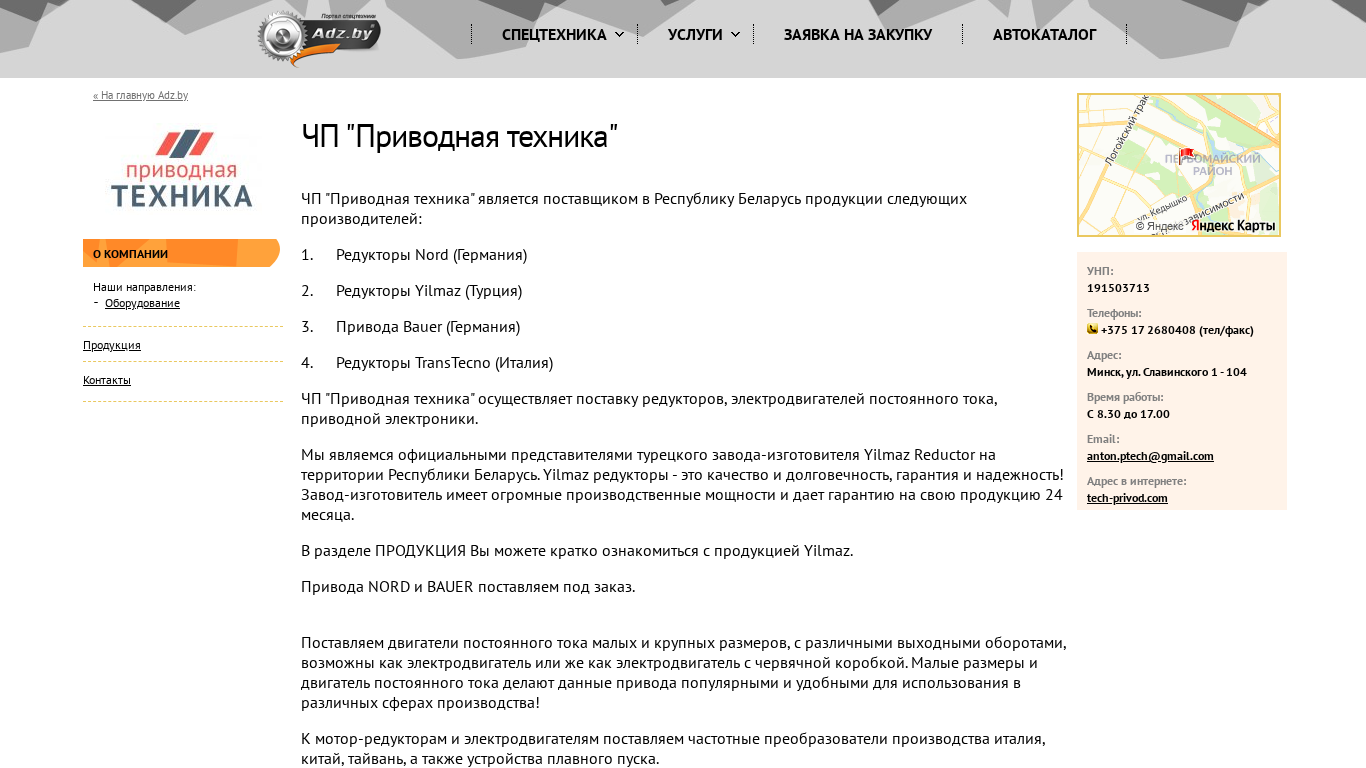 | AI-анализ | The website ЧП "Приводная техника" (tech-privod.com) is a supplier in Belarus of equipment and spare parts from the following manufacturers: 1. Nord reducers (Germany) 2. Yilmaz reducers (Turkey) 3. Bauer drives (Germany) 4. TransTecno reducers (Italy) The website specializes in the delivery of reducers, DC motors, and drive electronics. It is the official representative of the Turkish Yilmaz Reductor factory in Belarus. Yilmaz reducers are known for their quality, durability, reliability, and 24-month warranty. The manufacturer has large production capacities and offers a 24-month warranty on its products. The PRODUCTS section provides a brief overview of Yilmaz's product range. NORD and BAU |