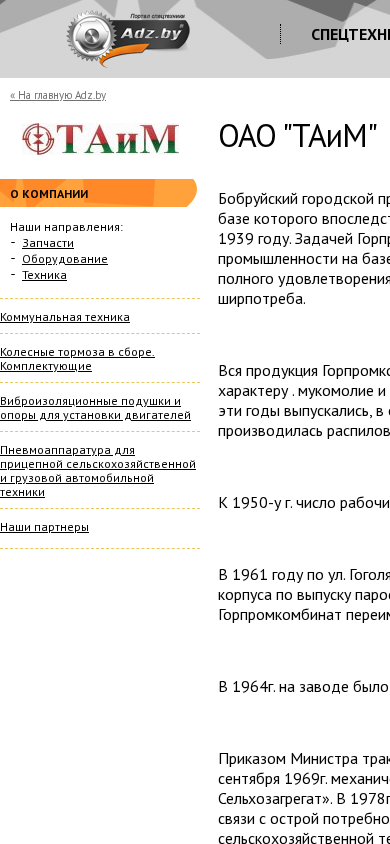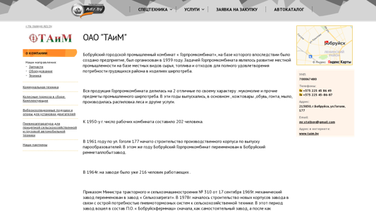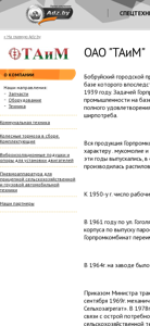 | AI-анализ | This online resource represents the official website of OAO "ТАиМ" (TAIM) in Belarus. The website offers specialized machinery, equipment, parts, services, rental, repair, credit/leasing, and cargo transportation. The main sections of the site include spare parts, equipment, machinery, communal equipment, and brake discs in assemblies. The company's partners can be found on the site, along with their UNP number, contact phones, and address. The website was established in 1939 as Bobruisk City Industrial Combine (Gorpromkombinat), which aimed to develop local industry using local resources, raw materials, and waste for the production of consumer goods. Over the years, the combine primarily produced leather goods, footwear, roofing materials, soap, and provided forestry services. By 1950, the workforce had grown |