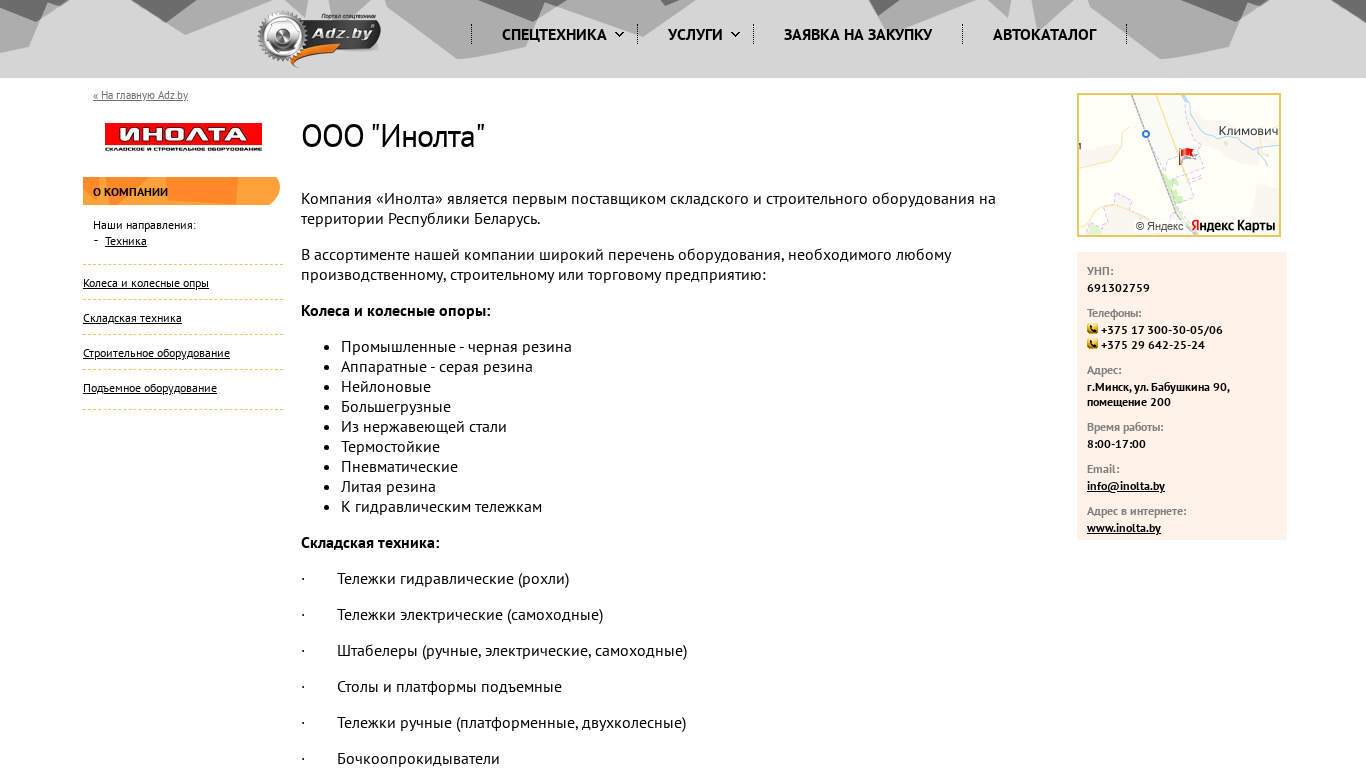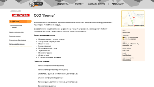 | AI-анализ | The portal "ООО «Инолта»" is a Belarusian company specializing in the supply of industrial equipment, construction equipment, and spare parts. The company's product range includes industrial tires (black and gray rubber), pneumatic tires, nylon tires, heavy-duty tires made of steel, thermostable tires, and rims for hydraulic telehandlers. In addition, the company offers forklift trucks, electric forklifts, manual and electric stackers, lifting tables and platforms, manual and electric hand trucks, and bottle tippers. Construction equipment includes crane jibs, building timber, cranes (scissor lifts and telescopic cranes), and building cranes. The company maintains partnerships with leading manufacturers of industrial and construction equipment, tires, and rims. The company's experience on the Belarusian market is significant, |