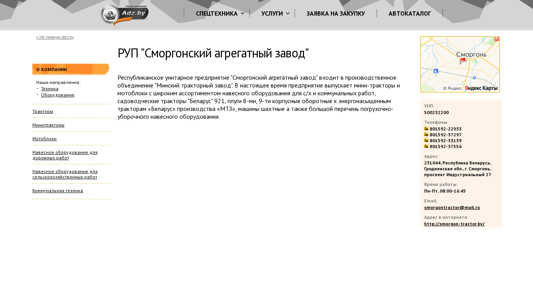 | AI-анализ | This website is for РУП "Сморгонский агрегатный завод," a Belarusian company that produces agricultural and construction machinery under the brand "Беларус." The company is a part of the "Минский тракторный завод" production alliance and manufactures a wide range of tractors, minitractors, and motorblocks with attachments for agricultural and communal works, as well as gardening tractors and mining machinery. The website provides contact information, including addresses, phone numbers, and email, for customers to inquire about purchases, services, and rentals. The business hours are listed as Monday to Friday, 8:00-16:45 local time. The website is hosted on the Adz.by domain. |