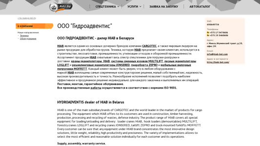 | AI-анализ | The portal of OOO "Гидроадвентис" is a Belarusian business website specializing in the sale and rental of HIAB equipment and other related machinery. The company is a dealer of HIAB in Belarus and offers a wide range of products for various industries including construction, timber harvesting, production, processing, and recycling of wastes, as well as the defense industry. The equipment includes loader cranes, hook loaders, forestry cranes, and recycling cranes, as well as hydraulic borers and mobile lifting platforms. The website provides contact information, including phone numbers and an email address, for customers to inquire about purchases and services. All production work is carried out in accordance with ISO 9001 standards. |