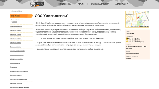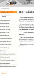 | AI-анализ | The web project "ООО «СоюзМашПром»" is a Belarusian business specializing in the distribution of Belarusian-made automobile, agricultural, and specialized equipment in Russia. The company acts as a dealer for various Belarusian manufacturers including Minskiy Avtozavod, Bobruyskagromash, Bobruyskselmash, Lidselmash, Lidagroprommash, Orshagropromash, Kohanovskiy ekskavatornyy zavod, Gidroselmash, Techmas, Minoytinskiy remontnyy zavod, and Minskiy zavod shesteren. The website provides a price list for their offerings from Minskiy traktornyy zavod and Amkodor. The company's status and pricing policies |