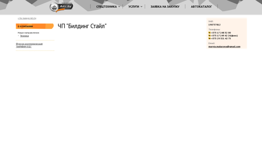 | AI-анализ | The portal "ЧП "Билдинг Стайл" is a business-to-business website specializing in the sale, rental, repair, financing, and transportation of building and special technology equipment, as well as spare parts. The website offers services such as request for quote and purchase. The main products include isothermic furgons of the "КАРАВАН-502" brand. The company's UNP number is 190737812, and their contact information includes telephone numbers +375 17 248 32 00, +375 17 249 42 26 (fax), and +375 29 321 42 75, as well as an email address maryia.makarova@gmail.com. The |