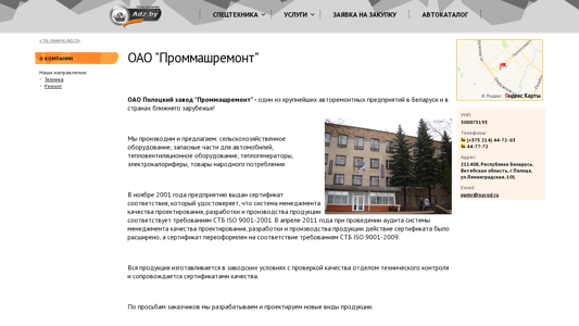 | AI-анализ | The website is for OAO "Проммашремонт" (Prommashremont LLC), a large auto repair company based in Belarus. The company offers a range of products and services including agricultural equipment, auto parts, thermal ventilation equipment, heat generators, electric heaters, and consumer goods. The business holds certificates of compliance with the ISO 9001 standards since November 2001, with the certificate updated in April 2011 to meet the requirements of ISO 9001-2009. The company manufactures all products in-house with quality control oversight and provides services for engine repair of automobiles and repair of zernosushilka M-819 KZS top burners. Prommashremont also has a certificate for technical servicing and repair of automotive transport vehicles, updated in February |