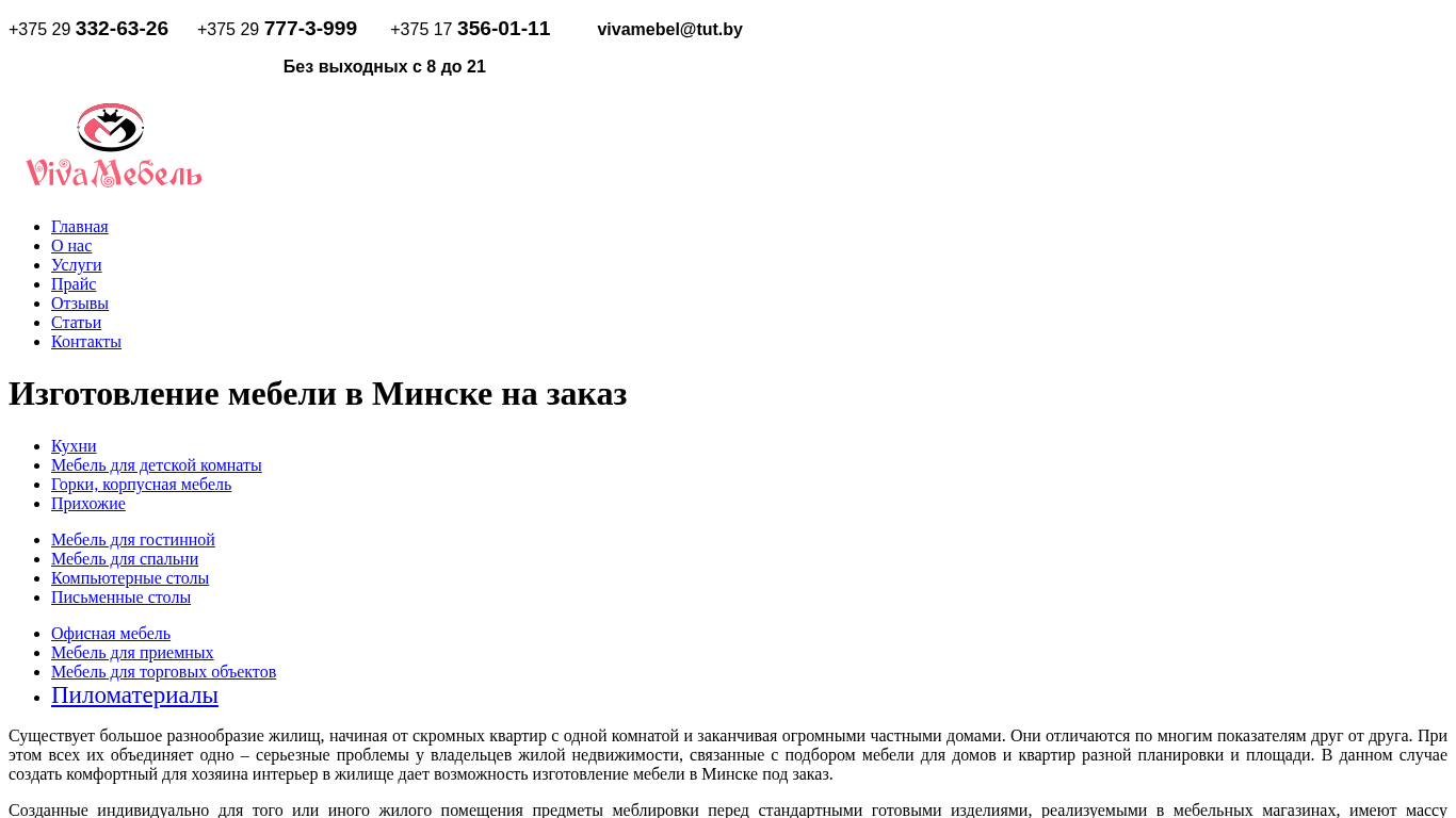 | Адрес | Услуги, Прайс, Отзывы, Статьи, Контакты, Контакты, Частное Предприятие "ВиваМебель", Офис:, г. Минск, ул. Пономаренко, 35А, оф. 220 |