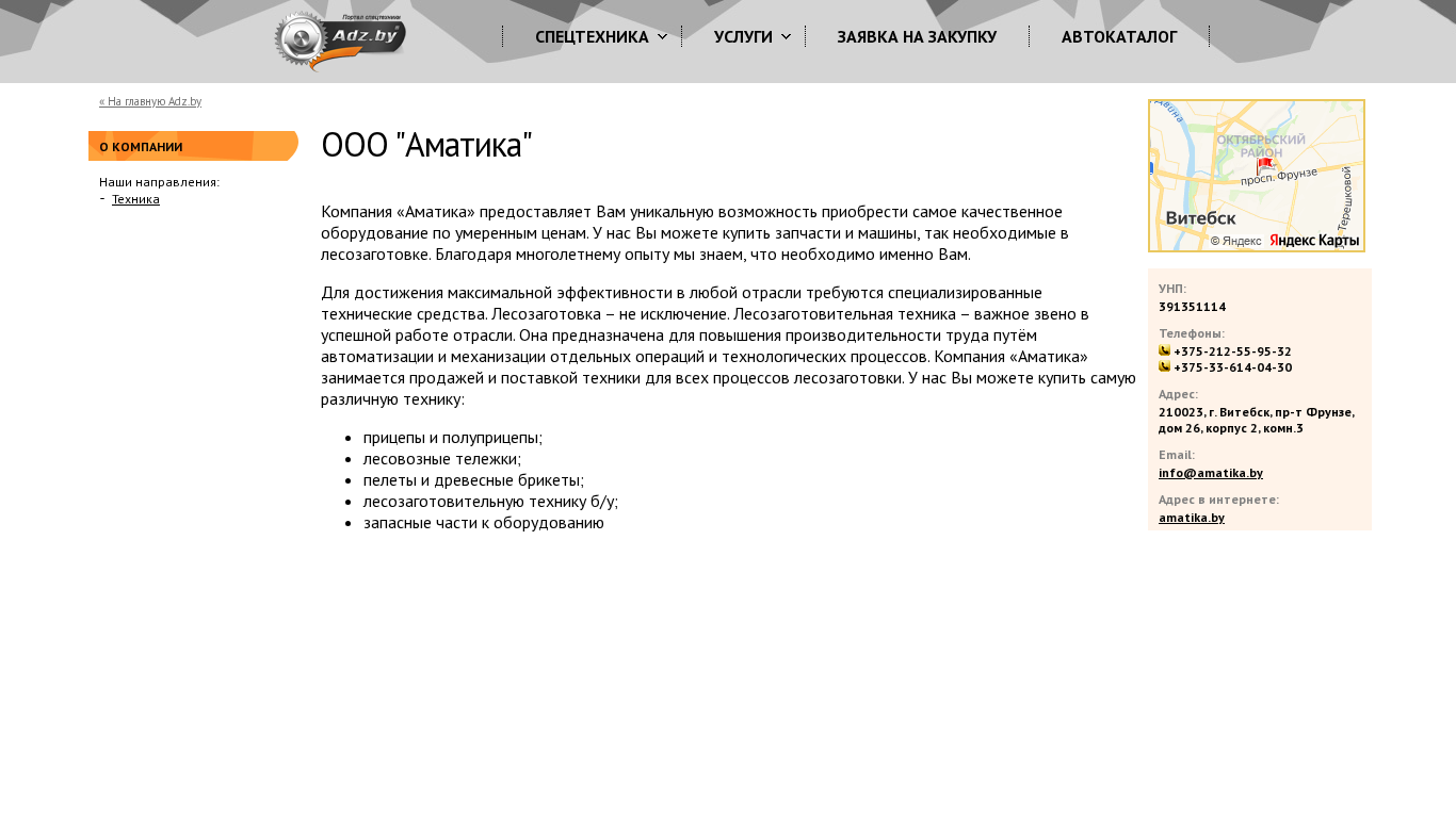 | AI-анализ | This website is for Company "Аматика" based in Vitebsk, Belarus, specializing in the sale of machinery and equipment, as well as spare parts for the logging industry. The company offers a wide range of products including trailers, log transport vehicles, pellets and wood briquettes, used logging equipment, and spare parts for logging machinery. The company emphasizes the importance of specialized equipment in increasing efficiency in various industries, with a focus on the logging sector. The website provides contact information, including phone numbers, address, and email, for customers to make purchases or inquiries. |