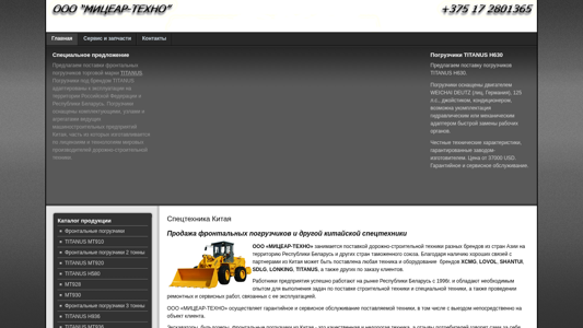 | AI-анализ | This online resource, titled "Спецтехника Китая" (Specialized Technology of China), is an e-commerce platform specializing in the sale of Chinese specialized technology, primarily focusing on front-end loaders under the TITANUS brand. The website offers high-quality products at reasonable prices. The main sections include "Service and Parts," "Contacts," and "Special Offers." The website promotes the sale of TITANUS H630 front-end loaders, which are equipped with a DEUTZ engine (licensed from Germany), 125 horsepower, a joystick, air conditioning, and the option for hydraulic or mechanical quick-change work tool adapters. The website also offers other brands such as XCMG, LOVOL, SHANTUI, SDLG, LONKING, and TITANUS upon |
