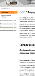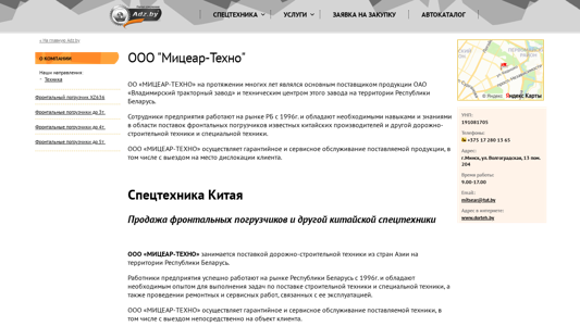 | AI-анализ | The web project "Micear-Techno" is a Belarusian company specializing in the sales, rental, repair, and financing of construction machinery and heavy equipment, with a focus on front-end loaders from Chinese manufacturers. Established in 1996, the company has been a major supplier of products from Vladimirsky Tractor Factory and serves as its technical center in Belarus. The team has extensive experience and knowledge in the local market and provides guarantee and service support for the equipment they sell, including on-site visits for clients. Micear-Techno imports construction machinery from Asian countries to Belarus and offers repair, maintenance, and financing services for these machines. They have been active on the Belarusian market since 1996 and have the necessary expertise to handle sales, delivery, and servicing of construction equipment and special machinery. The company's |