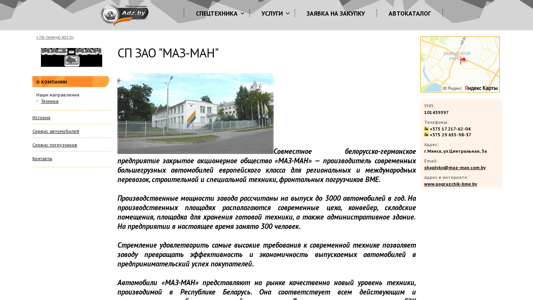 | AI-анализ | --- The portal maz-man.adz.by is a Belarusian business website for Maz-Man JSC, a closed joint-stock company specializing in the production and sale of modern heavy vehicles and special equipment for regional and international transport, construction, and other industries. The website provides information about the company's products, services, and contacts. Keywords associated with the website include 'Maz-Man', 'com', 'technology', 'equipment', 'parts', 'services', 'rental', 'repair', 'credits', 'lending', and 'transport'. The website also offers a catalog and a form for requesting a purchase. The production capacity of the company is for the release of up to 3,000 vehicles per year, and the website includes information about the company's history, address, and contact details. The company focuses on meeting the highest standards of |