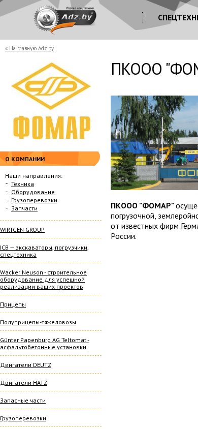 | AI-анализ | The portal ФОМАР is a Belarusian company specializing in the sale and repair of construction, road construction, loading, and earth moving equipment and machinery, as well as their spare parts from well-known German, Czech, Slovak, Polish, British, and Russian manufacturers. The website offers equipment from Wirtgen Group, JCB, Wacker Neuson, Günter Papenburg AG, Teltomat, DEUTZ, and HATZ, among others. The site includes sections for rentals, repairs, credits/leasing, and cargo transportation services, as well as a request for purchase form and an auto catalog. The company's contact information, including phone numbers, address, and email, is provided. The business hours are from 8:30 AM to 5:00 PM, Monday through Friday, with weekends closed. |