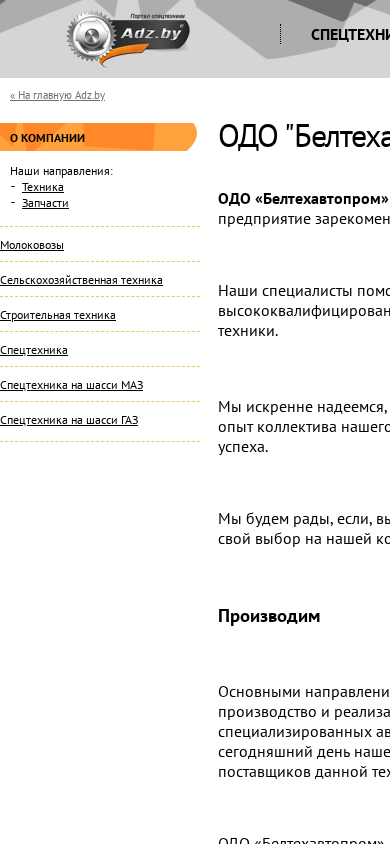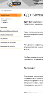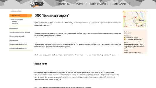 | AI-анализ | The website "ОДО «Белтехавтопром»" is a Belarusian company that specializes in the production and sale of agricultural, specialized vehicles, construction and road machinery, and their spare parts. The company, established in 2003, is one of the largest suppliers of such equipment in Belarus. The website offers a catalog of their products, which include loading trucks for dry feed, concrete mixers on MАZ chassis, and milk tankers on MАZ chassis. All products are certified and come with the necessary certifications. The website also provides consultation services to help customers make informed purchasing decisions. The company's contact information is provided, including phone numbers and an email address. |