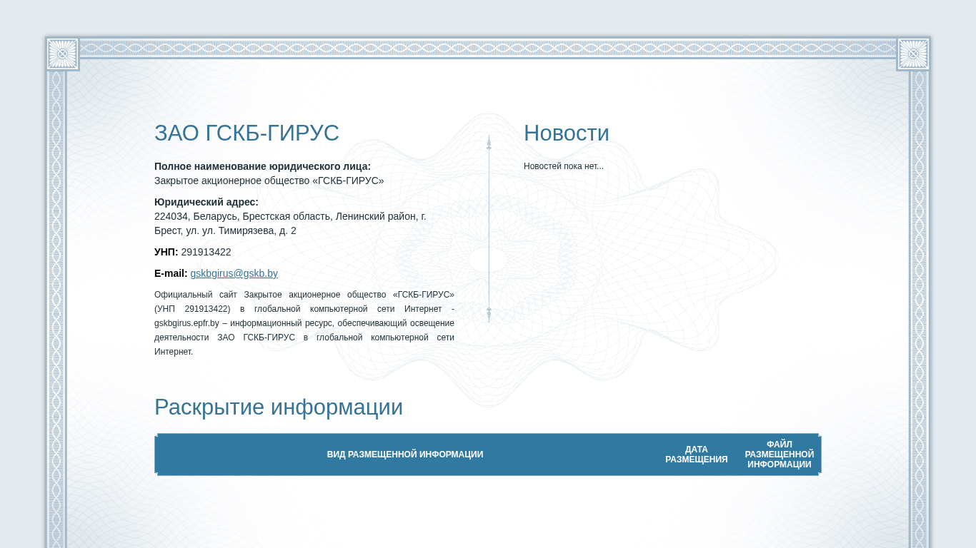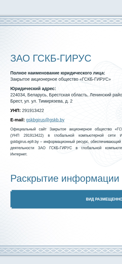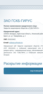 | AI-анализ | This online resource is the informational website of Closed Joint Stock Company 'GSKB-GIRUS' (UNP 291913422), registered in Belarus, located at the address: 224034, Belarus, Brest region, Leninsky district, Brest city, ul. Timiryazeva, 2. The website, named 'gskbgirus.epfr.by', provides information about the company's activities in the global computer network Internet. The website was registered from 2012 to 2025 and includes sections for news, access to a personal cabinet with an email and password login, and a registration form for new users. The website also uses Google Analytics for tracking user behavior. |