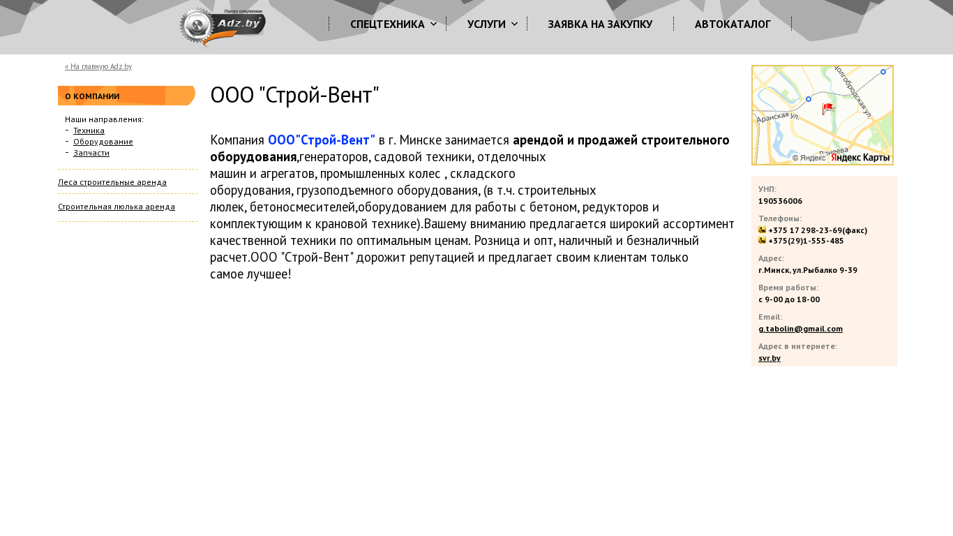 | AI-анализ | The portal OOO "Строй-Вent" is a company based in Minsk, Belarus, offering equipment rentals and sales of construction machinery, generators, lawn equipment, decorative machines, industrial wheels, warehouse equipment, lifting equipment (including crane equipment), and concrete machinery. Their product range includes staging platforms, concrete mixers, and equipment for working with concrete. They pride themselves on providing high-quality equipment at optimal prices, with options for both retail and wholesale transactions, as well as cash or credit/leasing payments. The company's address is ul. Rybalko 9-39 in Minsk, and their working hours are from 9:00 to 18:00. Their contact information includes phone numbers +375 17 298-23-69 (fax) and +375( |