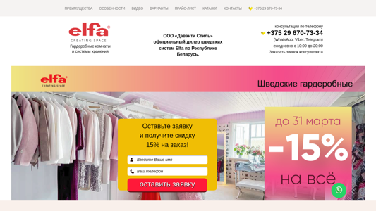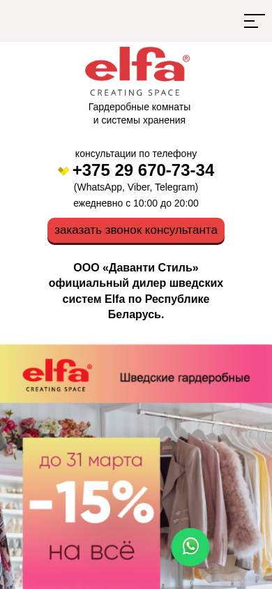 | AI-анализ | The website is a Belarusian e-commerce platform selling Elfa storage systems. The website offers benefits and features, videos, variations, and a price list, as well as a catalog and contacts for ordering. Elfa is a Swedish brand that has been researching and producing storage solutions for over 60 years and is known for its quality and durability. The website offers gárderobné (gardeробные) systems and utility systems for various spaces. Visitors can place orders by phone or leave a request for a consultant's call. Elfa's systems are suitable for any room, including garages, and offer customizable options. The website provides videos and catalog information for customers to make informed decisions. The Swedish company Elfa International AB has been developing and producing storage systems for over 60 years and is known for its quality and durability. The website offers Elfa's gárderobné |