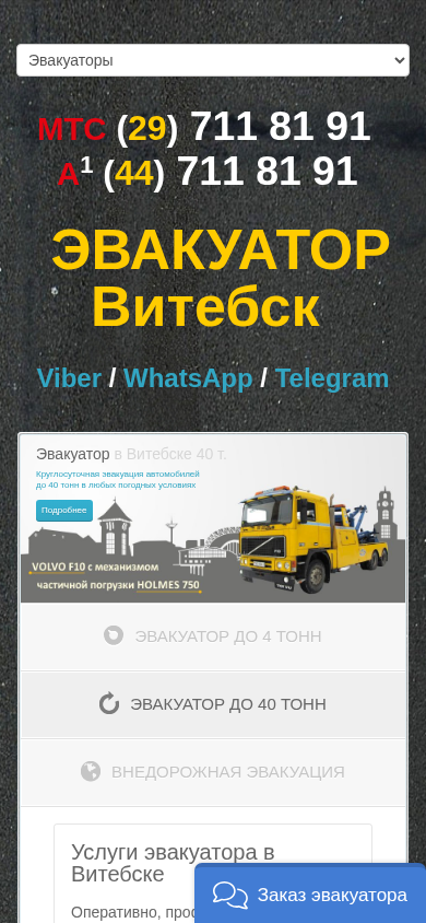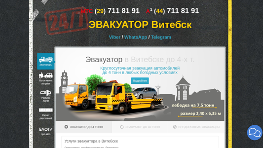 | AI-анализ | The portal evakuator-vitebsk.by is an auto assistance and evacuation service based in Vitsebsk, Belarus. It offers round-the-clock emergency evacuation of vehicles up to 4 tons in weight, including passenger cars, minivans, small trucks, special vehicles, and microbuses. The service is available throughout Belarus and CIS countries, using an Iveco 3512 evacuator. The company provides assistance regardless of weather conditions or holidays. Services include towing, pulling out of mud, transmission reset, and distance calculation for the vehicle. The website also mentions heavy evacuation services up to 40 tons and in-depth information on these services is available. The company's contact details include phone numbers, Viber/WhatsApp/Telegram, and an address in Vitsebsk. The domain is focused on providing professional, |