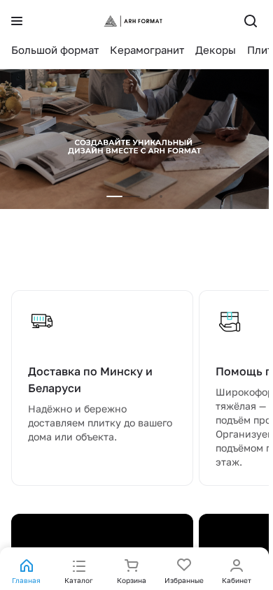 | AI-анализ | --- The web project "Салон широкоформатного керамогранита" (ArhFormat) is a website dedicated to selling and showcasing large-format ceramic tiles. The site features a catalog of various tile formats, including marble, stone, concrete, wood, metal, monochrome, and decor. It also offers prefabricated solutions and collaborations with brands like TerzaDimensione, Mirage, Porcelanosa, TAU Ceramica, and Proconcept. The company, located in Minsk, Belarus, provides phone and email contact information, and operates from Monday to Saturday, 10:00-19:00 and Sunday, 11:00-17:00. The site includes sections for ordering a call, help, conditions of payment and delivery, and information about the company. |