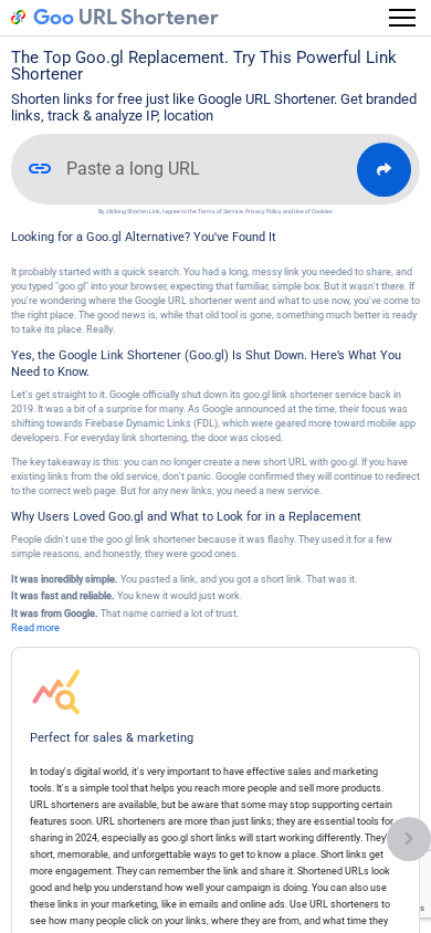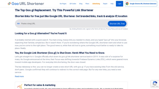 | AI-анализ | --- This online resource is a free URL shortener similar to Google's goo.gl service. The website's title and description suggest it is an alternative for those missing the simplicity of goo.gl, offering advanced analytics and custom URL options. Top keywords include 'goo.gl', 'URL', 'links', and 'shortener'. The website contains pages for Goo URL Shortener, Bio Pages, QR Codes, a Blog, Plans, Advertising, Report, and Help, as well as a login page and a Google Chrome URL Shortener Extension. The top words in the text are 'the', 'url', 'and', 'links', 'goo', and 'you'. The website explains that Google's goo.gl link shortener service was discontinued in 2019, and users are encouraged to try this alternative for shortening links. The website |