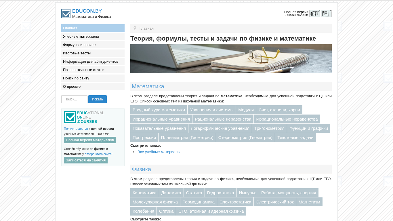 | Название / Заголовок | Теория, тесты, задачи и формулы по физике и математике. Очная, заочная и онлайн подготовка к ЦТ, ЕГЭ. Обучение физике и математике. |