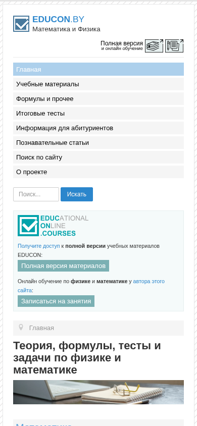 | SEO-описание | Теория, тесты, задачи и формулы по физике и математике. Очная, заочная и онлайн подготовка к ЦТ, ЕГЭ. Обучение физике и математике. |