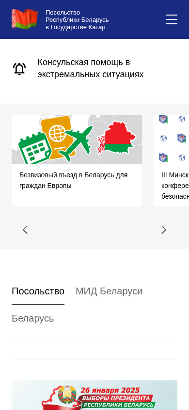 | AI-анализ | This website is the official website of the Embassy of the Republic of Belarus in the State of Qatar. The title of the website is "Посольство Республики Беларусь в Государстве Катар" in Russian, and the description contains the keywords "посольство", "республика беларусь", "катар", and "консульские". The top words on the website include "посольство", "россия", "беларуси", "отделение", "беларусь", "генконсульство", "2025", "катар", "въезд", "граждан", "республики", "безвизовый", "работы", "иностранных", "китай", "польша", "контакты", "время". The |