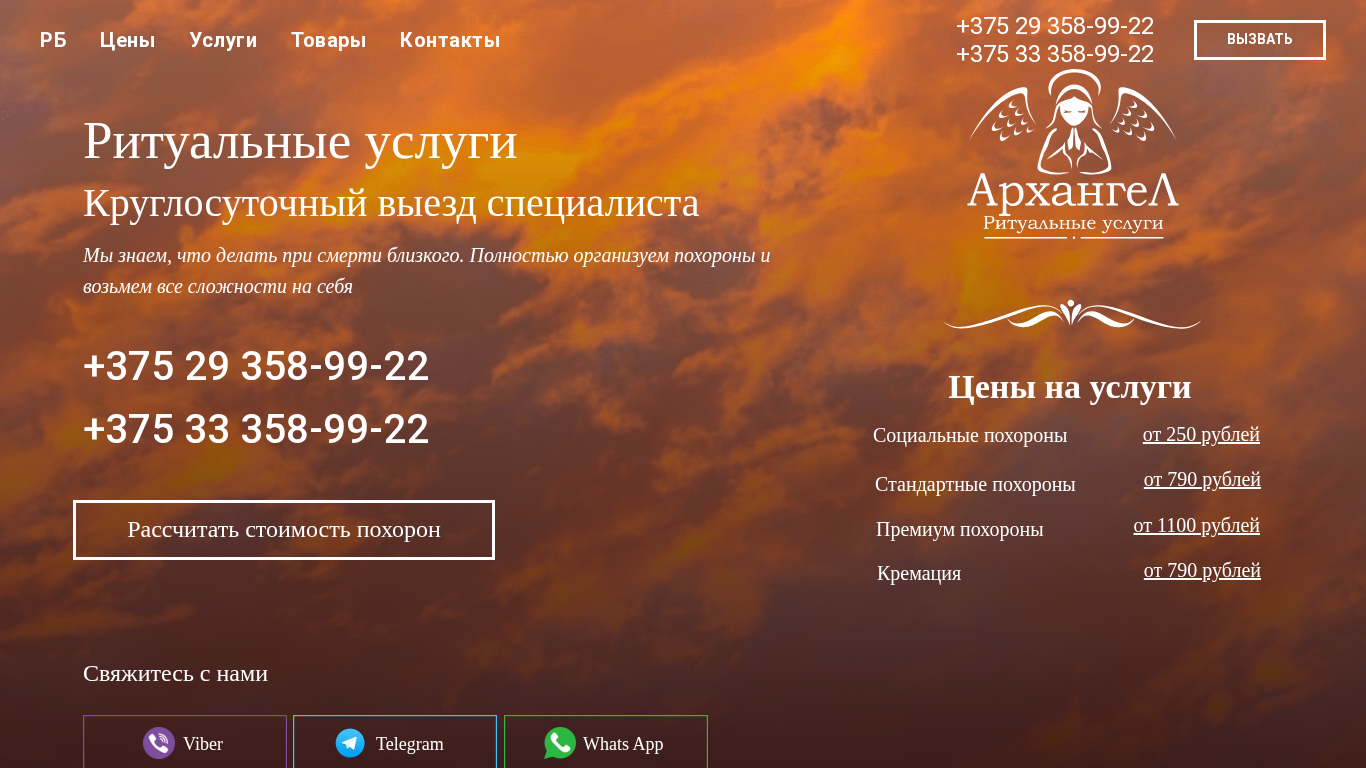 | Название / Заголовок | Ритуальные услуги круглосуточно | Ритуальная служба "Архангел" |