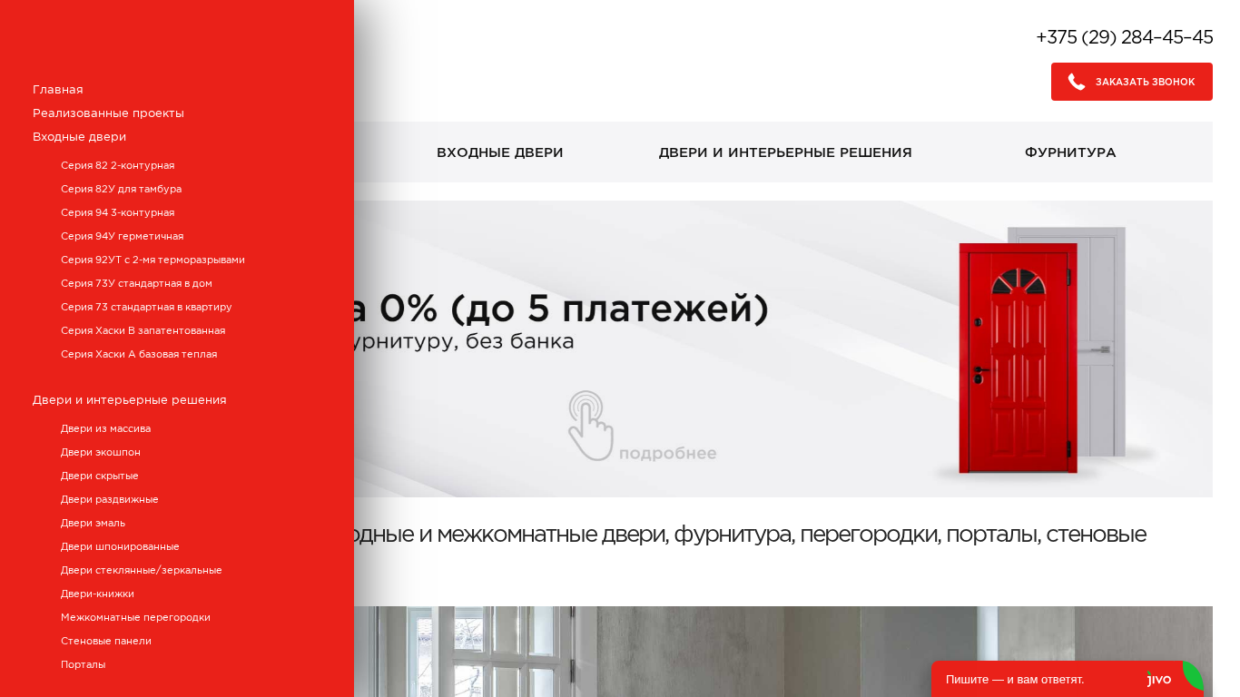 | SEO-описание | Рассрочка (без банка) на 5 платежей. Кредит 4% на 3 года. Входные и межкомнатные двери, фурнитура, перегородки, порталы, стеновые панели, плинтуса и прочее. |