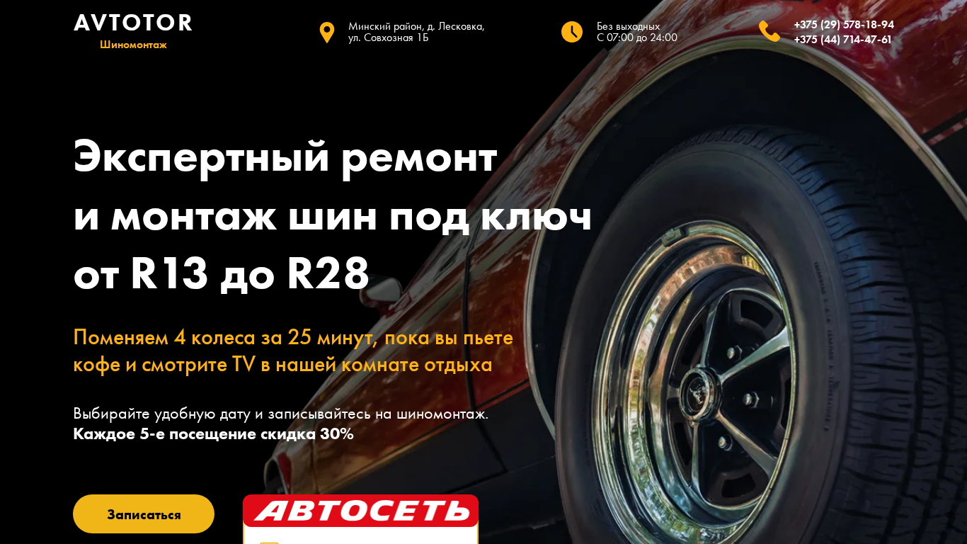 | SEO-описание | AVTOTOR. Минский район, д. Лесковка, ул. Совхозная 1Б. Шиномотнаж. Без выходных. С 8:00 до 23:00. +375 (29) 578-18-94 +375 (44) 714-47-61 |