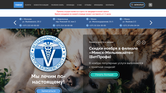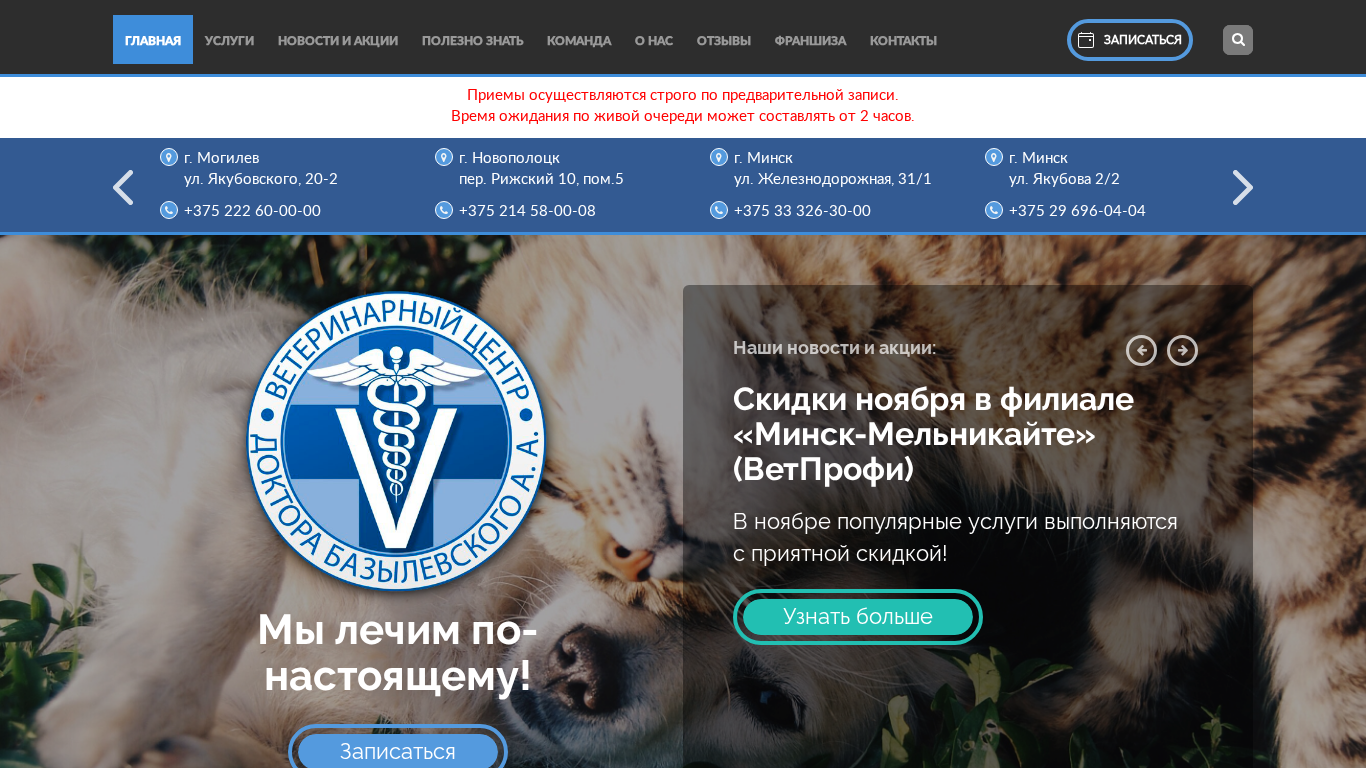 | SEO-описание | Мы лечим по-настоящему! Ветеринарный центр доктора Базылевского А.А. – Сеть ветеринарных клиник в Витебске, Минске, Новополоцке, Волковыске и Могилеве |
