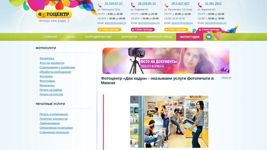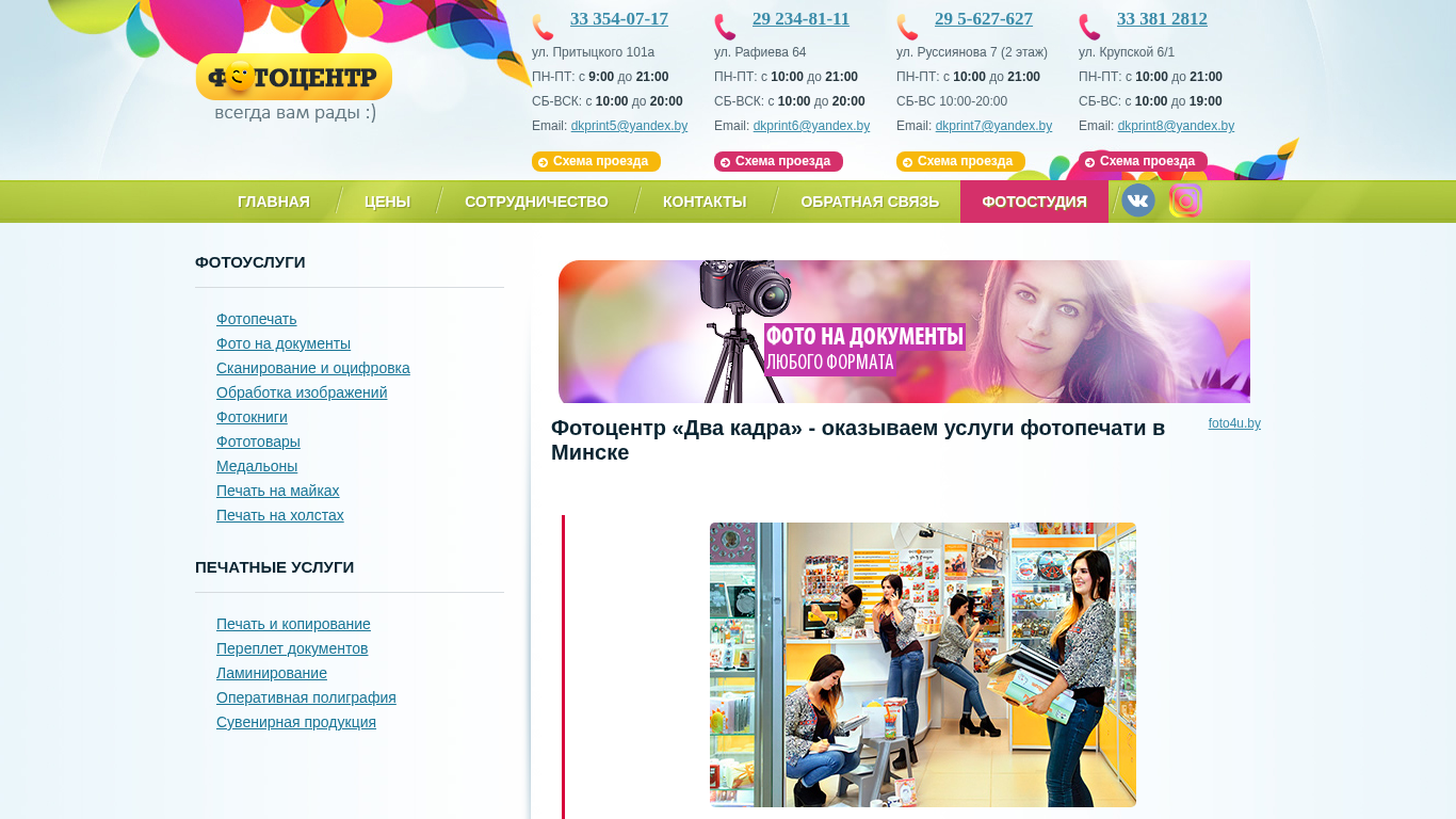 | Название / Заголовок | Срочное фото, печать, ксерокопия, фото на кружках/майках/подушках, фотокниги,ламинирование и еще больше услуг. Фотоцентр «Два кадра» в Минске. |