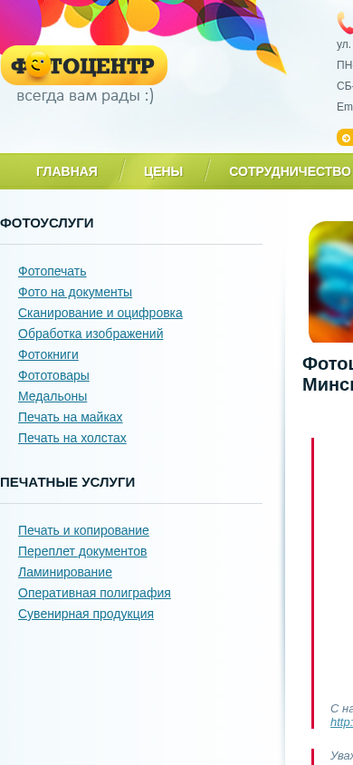 | SEO-описание | Срочное фото, печать, ксерокопия, фото на кружках/майках/подушках, фотокниги, сканирование и оцифровка, ламинирование в центре Минска, ст.м. Уручье, ст.м. Пушкинская, ст.м. Каменная горка, |