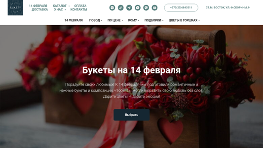 | AI-анализ | Этот сайт — онлайн-магазин цветов в Минске, Беларусь, носит название B.U.K.E.T.Y. Он предлагает только свежие цветы для доставки или самовывоза в пределах Минска. Покупатели могут узнать о ценах и сделать заказ на красивые букеты или композиции через предоставленный формуляр, который включает поля для имени, номера телефона, электронной почты, даты доставки и времени самовывоза. Сайт предлагает различные варианты доставки и самовывоза, включая самовывоз на их адрес по ул. Ф.С.Кориня, 9. Сайт также предоставляет информацию о способах оплаты, включая экспресс-оплату и различные системы онлайн-платежей. На сайте представлен каталог цветочных композиций, цены по типу и случаю, а также раздел "Часто задаваемые вопросы". Похоже, что на момент последнего обновления сайт готовит специальные предложения для Дня святого Валентина. |