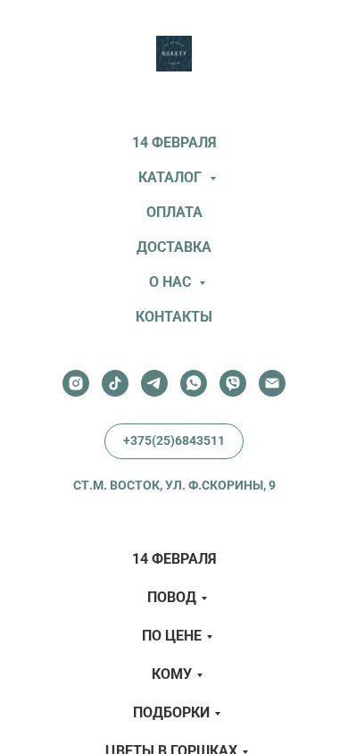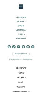| Адрес | основному контенту, 14 февраля, Каталог, Оплата, Доставка, О нас, Контакты, +375(25)6843511, СТ.М. ВОСТОК, УЛ. Ф.СКОРИНЫ, 9 |