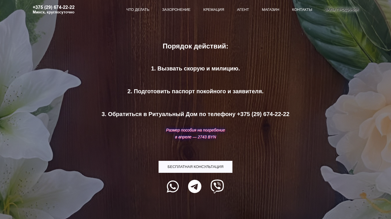 SEO-описаниеКруглосуточная организация похорон в Минске под ключ. Помощь с документами, пособием, погребением и кремацией. Ритуальный магазин принадлежностей. Бесплатная консультация 24/7: +375 (29) 674-22-22