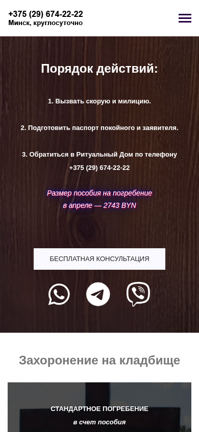 Портал Bel-Ritual.by — это круглосуточная организация по похоронным услугам в Минске, Беларусь. Он предлагает помощь с документами, консультации, похороны и кремацию. На сайте представлен магазин ритуальных аксессуаров. Пользователи могут связаться по телефону +375 (29) 674-22-22 для бесплатной консультации. Процесс организации похорон включает в себя вызов экстренных служб, подготовку документов покойного и заявителя, а также обращение в похоронный дом. Стоимость стандартных похорон в апреле составляет 2743 BYN. Услуги включают подготовку тела, социальное захоронение, типичный крест, мемориальную доску, символический венок и носильщиков. Покупатели также могут выбрать индивидуализированные похороны с персонализированными ценами. Стандартная кремация включает подготовку тела, социальный гроб, типичный урн.