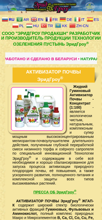| Ключевые слова | технология озеленения пустынь гуминовые концентраты эридгроу микроудобрения биостимуляторы роста мелиоранты почвоулучшители активизатор почвы восстановитель почвы сорбент нефти и нефтепродуктов |