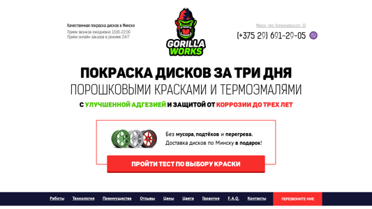 | AI-анализ | The web project "GorillaWorks.by" offers high-quality disk painting services in Minsk, Belarus. The company utilizes advanced technologies such as 3L and thermoemal coatings, as well as polymers, ensuring a three-year protection against corrosion and a flawless finish. Customers can choose from a variety of colors and enjoy free delivery within Minsk. The business has been in operation since 2015 and has painted over 24,000 disks for various car models including BMW, Audi, Mercedes, and others. The website provides a FAQ section, contacts, and an online order form for convenience. Prices for the different compacts range from 550 to 1400 byn. |