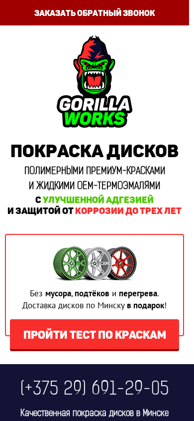 | SEO-описание | Качественная покраска литых дисков в Минске. Система жидких термоэмалей, технология 3L, полимер. Гарантия 3 года. Бесплатная доставка по Минску. Красим диски с 2015 года. |