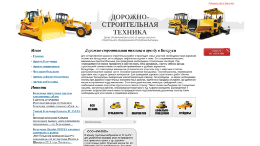 | SEO-описание | Объявления об аренде дорожно-строительной техники и услугах по строительству и ремонту дорог в Беларуси. Аренда бульдозера, аренда виброкатка, асфальтоукладчик в аренду. |
