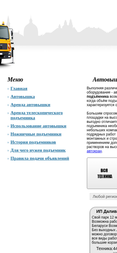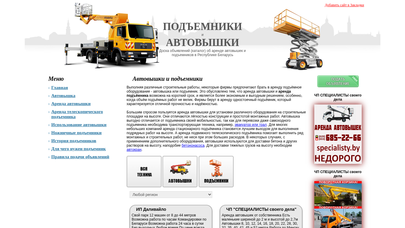 | SEO-описание | Объявления об аренде всех видов автовышек и подъемников Беларуси. Аренда автовышки, аренда подъемника в Минске. Услуги автовышки, автовышка в Минске и других городах РБ. |