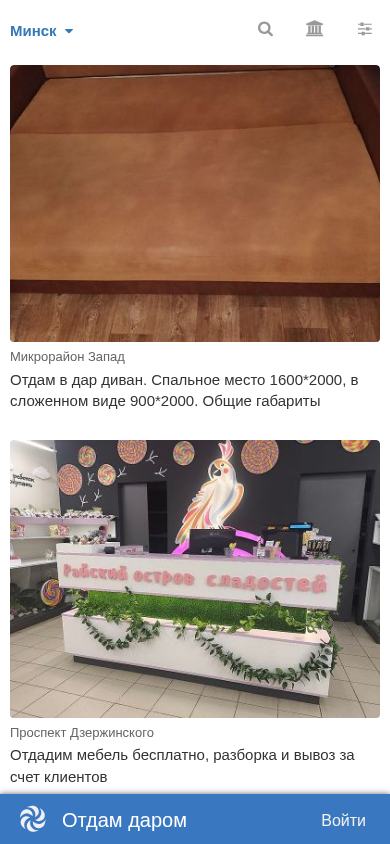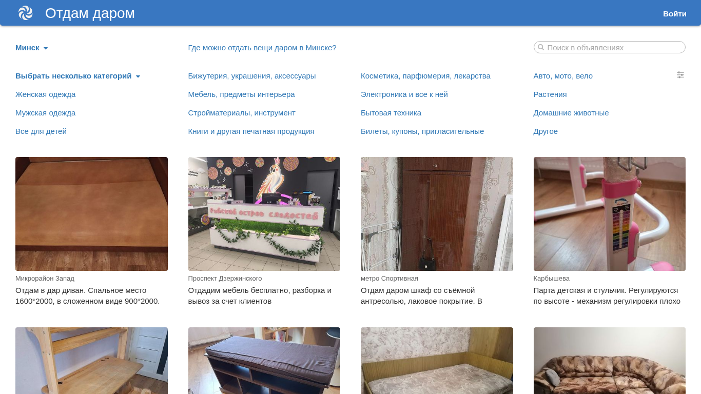 | SEO-описание | Объявления отдам даром в Минске. Женская, мужская и детская одежда, игрушки, мебель, бытовая техника, электроника, стройматериалы, книги, билеты, купоны, растения, животные |