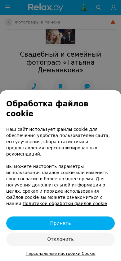 | AI-анализ | This website is dedicated to Tatiana Demyanova, a wedding and family photographer based in Minsk, Belarus. It provides contact information, including addresses and phone numbers, as well as reviews from previous clients. The website also includes a schedule of availability and a map to the location at Relax.by. Tatiana Demyanova offers services for swadebna (wedding), love story, detskaya (child), semeynaya (family), meropriyatia (events), fotoknigi i fotoproekty (photo books and projects), and provides professional photography with a creative approach and individualized attention to clients. The website includes a price list, portfolio, and additional information which can be accessed at tatya.by. The website also mentions the availability for on-location shoots, retouching, artistic processing, DVD/CD recording, photo album formatting, |
